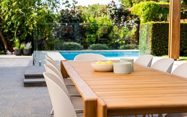 For a casual contemporary feel we have used the Link Outdoor Table and Smart Outdoor Armchairs in Bianco white by Varaschin. We love the warmth of the natural teak and the contrast with the textured rope weave of the chairs.