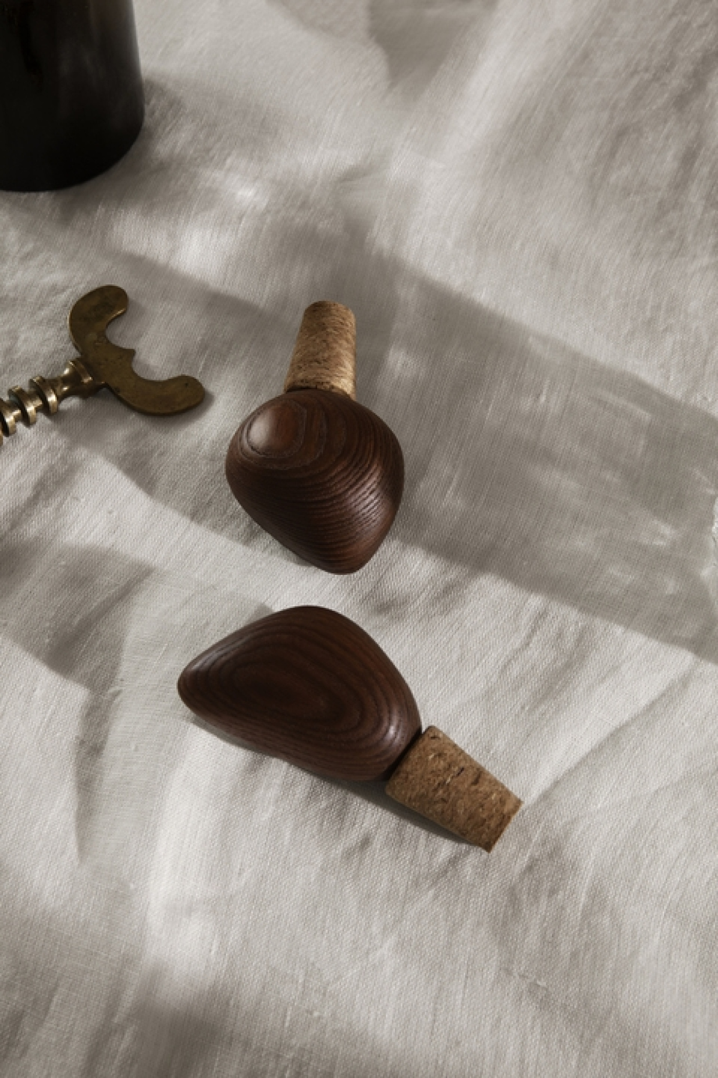Characterised by their soft curves and sculpted details, the Cairn Wine Stoppers offer a visually striking solution to preserving opened wine in its original bottle. Inspired by cairns, man-made stacks of stones that are often raised for memorial purposes, the artistic wooden shapes have been carved from FSC™-certified ash and treated with a carbonised finish, while the stoppers themselves are made from cork.