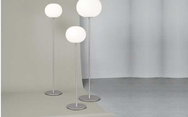 The GLO-BALL C/W ceiling, wall and mirror lamp designed in 2002 by Jaspar Morrison for FLOS, comprises of an externally acid-etched, hand blown flashed opaline glass sphere.