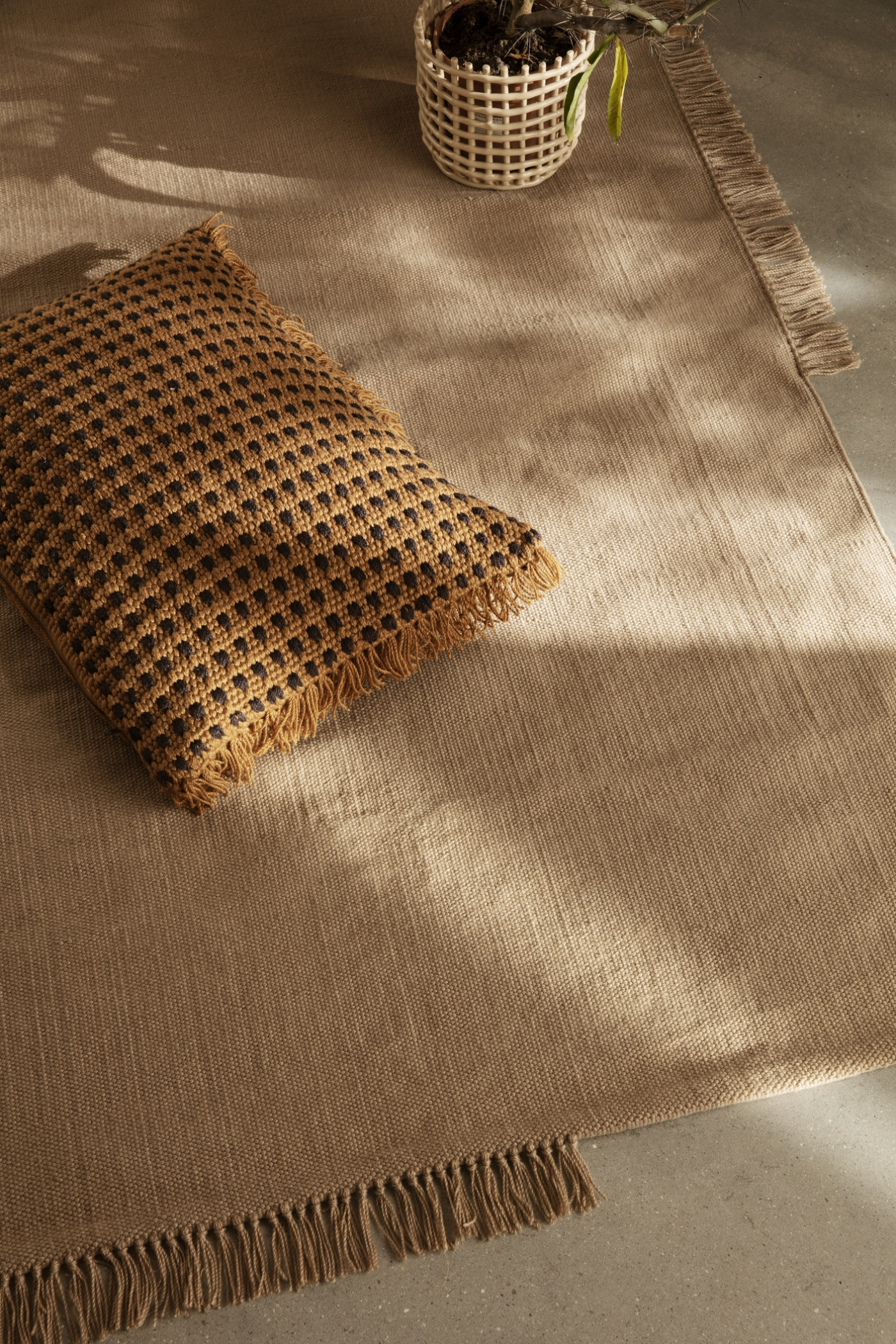 Our series of handwoven Hem Rugs puts post-consumer plastic to good use: each sustainable design is made from repurposed PET-yarn, giving you a soft yet durable finish with a tactile, woolen feel that works as well in your home as it does outdoors. The flatweave rug is detailed with asymmetrical rows of fringed trim that underscore its artisanal feel.