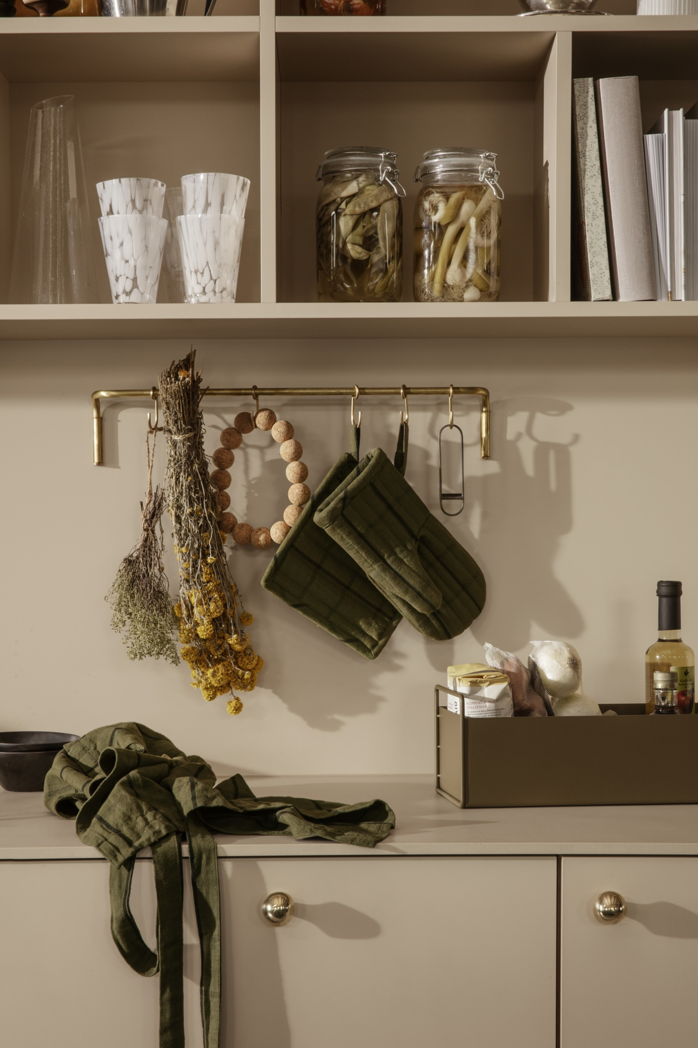 A light and beautiful storage solution for your kitchen tools and textiles, the kitchen rod lets you clear the table easily. Use it with the hooks to make room for more – use one of the hooks for decorations or memorabilia to mix up the expression of your rod. The kitchen rod is made of metal with a black coating and comes with six hooks.