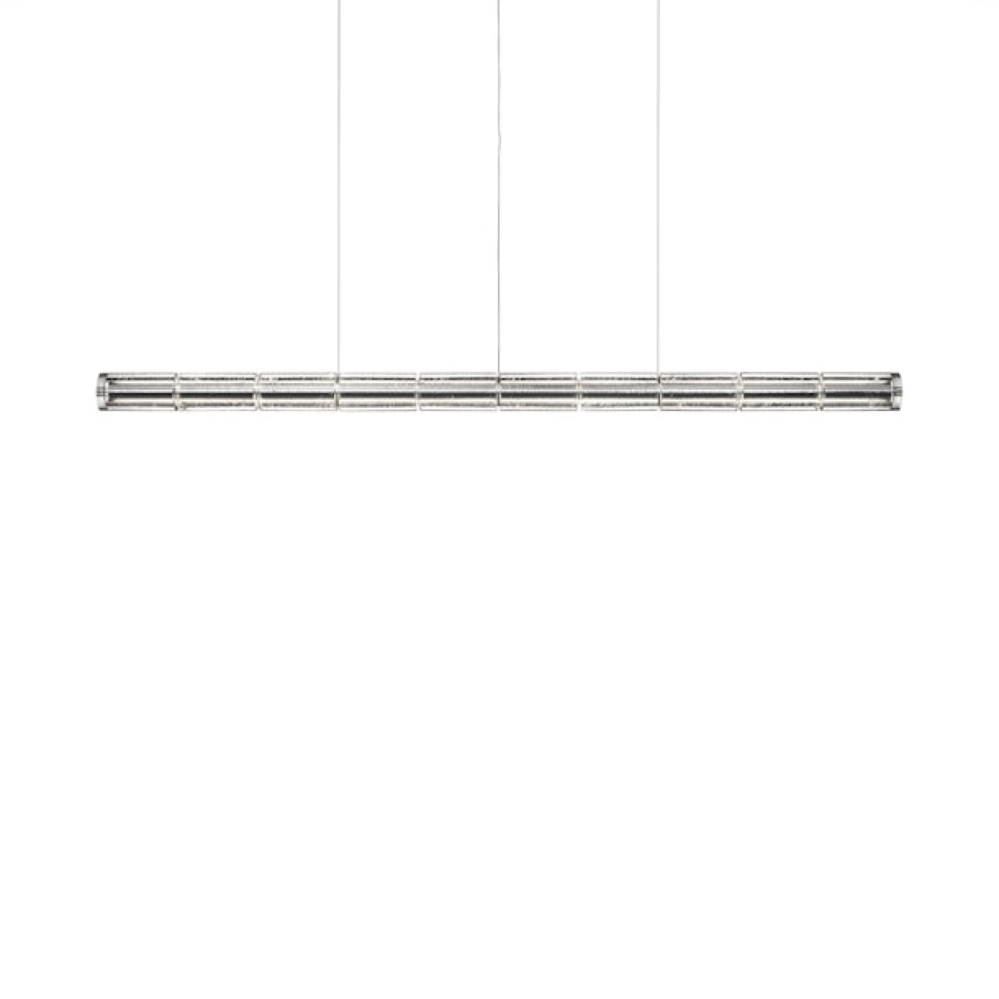 Suspended lamp consisting of interconnected glass modules that reach a length of 1.66 mt. (S1) 2.07 mt. (S2) 2.49 mt. (S3) with 2.70 m suspended power cable.The cylindrical transparent glass modules are created through an artisanal process by pouring the glass into a rotating mold to obtain an exclusive finish that makes each single piece unique. Internal structure in polished extruded aluminum equipped with two linear LED modules for direct and indirect lighting downwards. The modules can be easily removed and replaced in case of maintenance.The power supply unit and the Dali Dimmer are located within the ceiling rose while a touch control button, positioned on one end of the product, allows the luminaire to be controlled in three different modes.Control options available: TOUCH_ Features direct control via the touch button on the lamp. This option allows to dim and adjust the light intensity of both the up and down emission (individually or combined) from 10% to 100%.PUSH&TOUCH_Features remote on/off control via Push button as well as dim and adjustability of the light tensity of both the up and down emission (individually or combined) from 10% to 100% through the touch button integrated on the lamp.DALI&TOUCH_ Features remote on/off control via DALI DT6 as well as dim and adjustability of the light tensity of both the up and down emission (individually or combined) from 10% to 100% through the touch button integrated on the lamp.