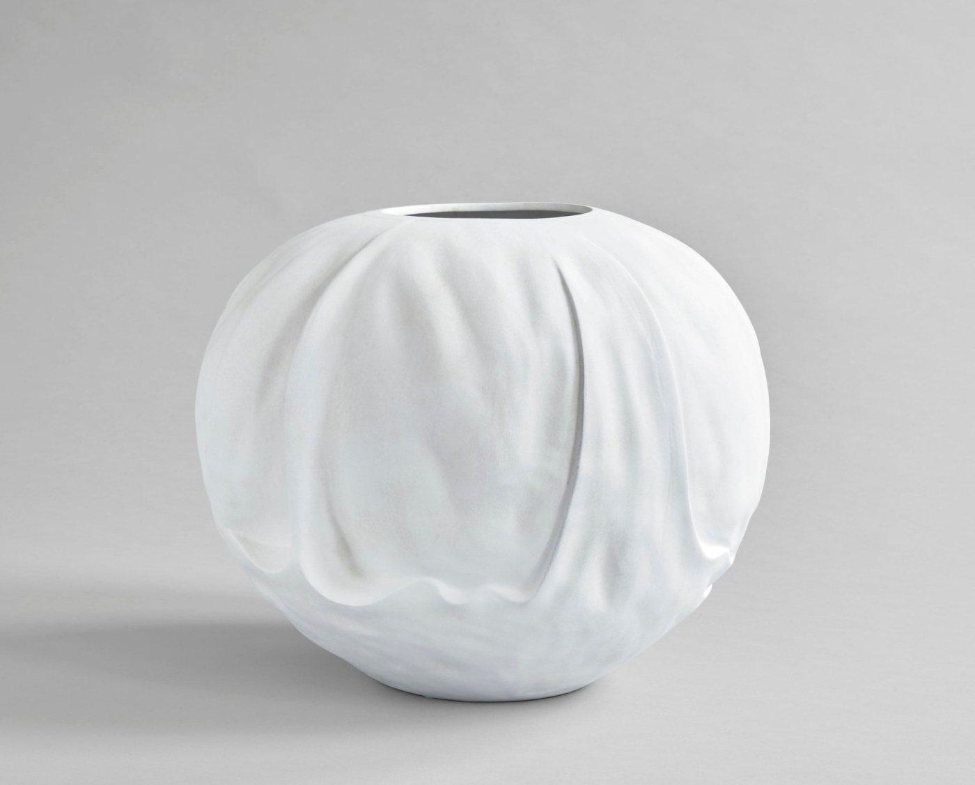 Inspired by the art of drapery, Orimono Vases reminisces the beauty of textiles falling in lavish curves. Orimono, the Japanese word for textile, is an ode to the Japanese way of working with textiles in both clothing and interior. Orimono Vases has an uneven surface of curves in different layers, creating a beautiful organic design with a handmade touch. Orimono Vases comes in three different sizes and is made from ceramic. The surface is hand glazed in order to achieve a unique surface texture. The colours may vary slightly, due to that it is a handmade product. The vase is not 100% waterproof, therefore a bag for fresh flowers is included. Designed by Kristian Sofus Hansen & Tommy Hyldahl.