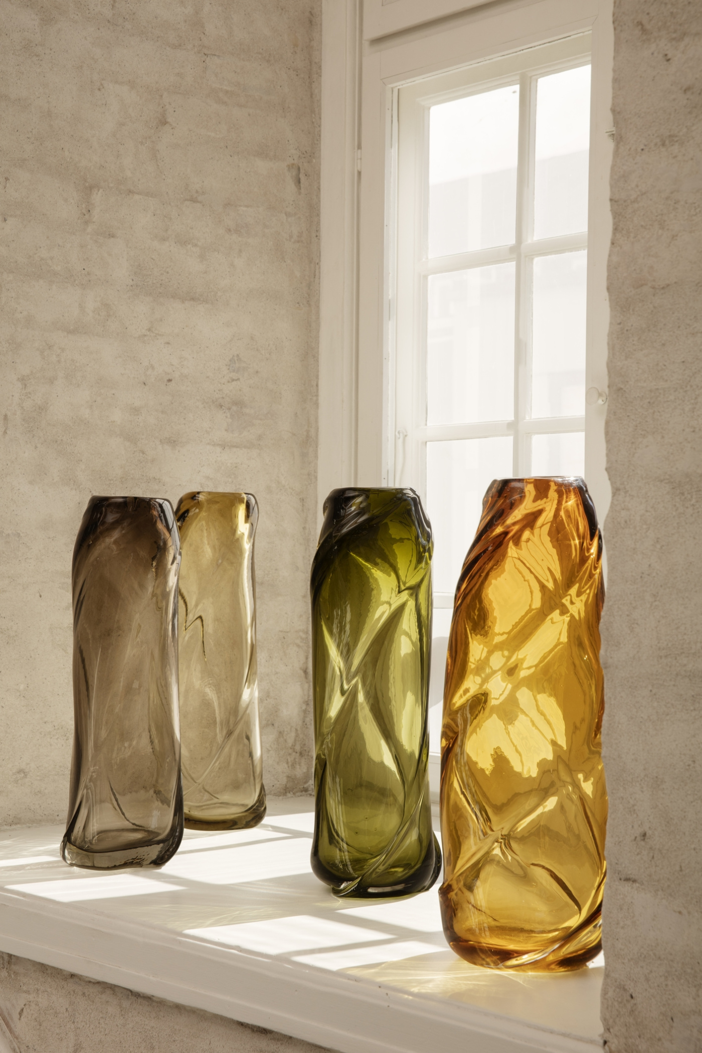 The mouthblown and oversized Water Swirl Vase recalls a whirl of cascading liquid. With its translucent coloured glass, the vase achieves a light and effortless, almost dancing, expression despite being crafted from solid, massive glass. Fill the vase with flowers or stalks, or style it solo and enjoy how the sun filters through the transparent glass. Enjoy the unique twists and curves of each individual piece, as no two vases are identical.