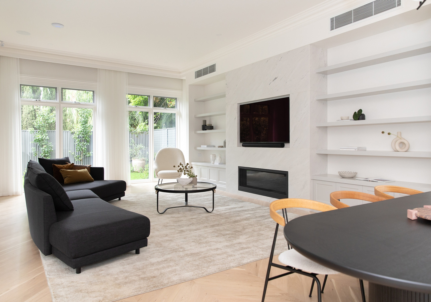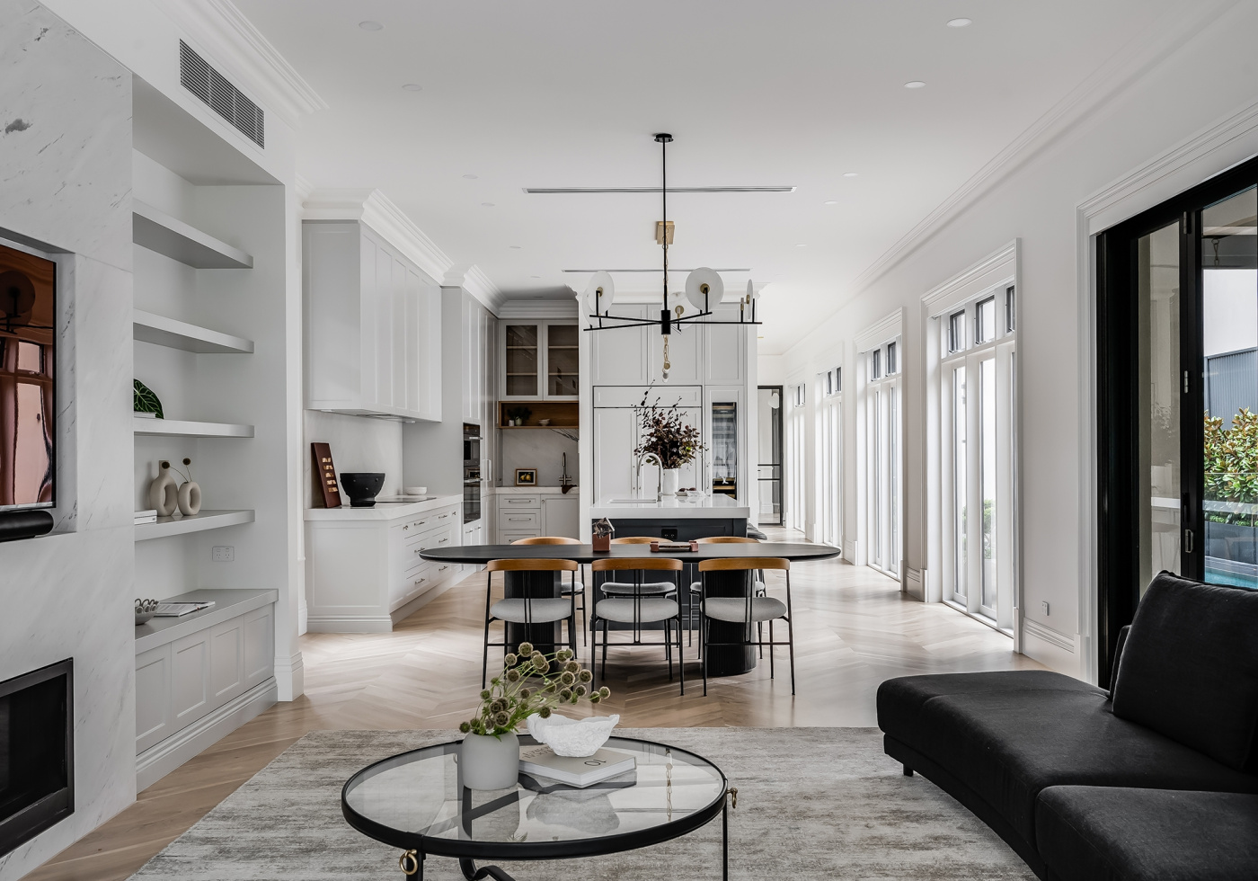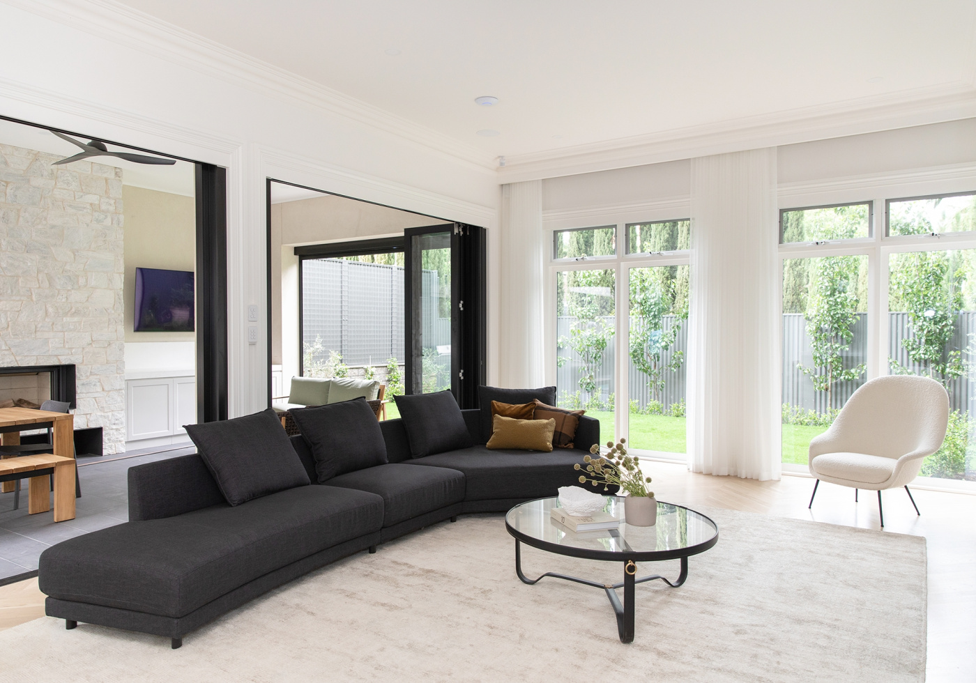 Nestled in Adelaide's prestigious inner north, this Genworth Group-crafted residence is a testament to architectural beauty and functional elegance. Its expansive windows stretch from floor to ceiling, bathing the open-plan living and dining areas in an abundance of natural light, which enhances the sense of spaciousness and connection with the outdoors. The thoughtful furniture curation by Transforma plays a pivotal role in this harmony, introducing softness and warmth that elevate the space's livability. Each piece and fabric has been meticulously selected to not only ensure a family-friendly atmosphere but also to embody the pinnacle of modern sophistication. In doing so, Transforma has seamlessly blended timeless design with contemporary luxury, creating an environment that is as inviting as it is refined.